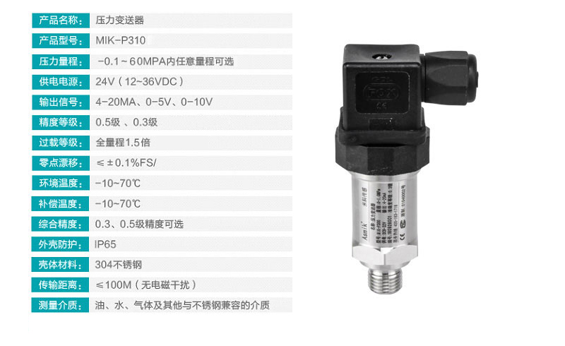 MIK-P310系列壓力變送器壓力敏感核心采用了高性能的進口硅壓阻式壓力充油芯體,內部的專用集成電路將傳感器毫伏信號轉換成標準電壓、電流或頻率信號,可以直接與計算機電路接口卡、控制儀表、智能儀表會PLC等方便相連。遠距離傳輸可以采用電流輸出方式。具有體積小、重量輕、全不銹鋼密封結構,可在腐蝕性環境中工作。該產品安裝方便簡潔,具有高抗震和抗沖擊性能。