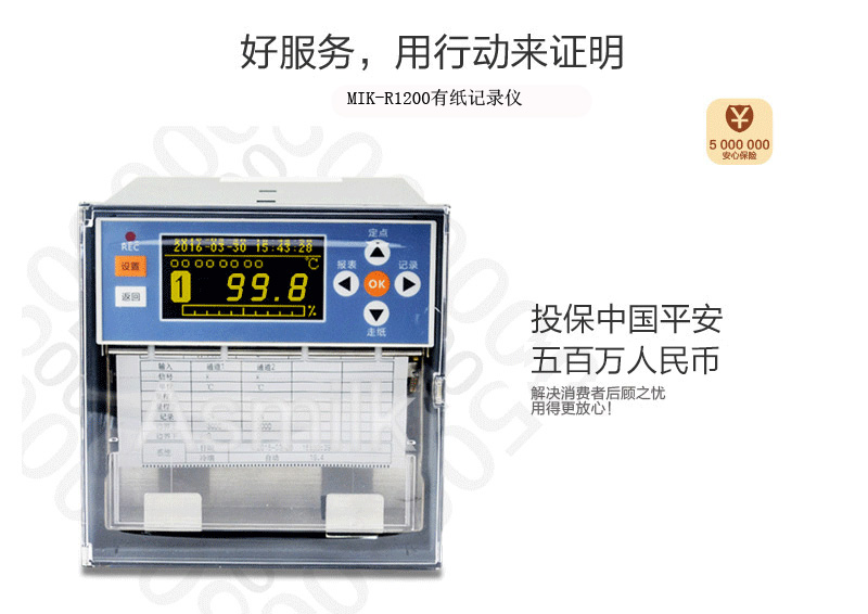 MIK-R1200有紙溫度記錄儀最多具有8路輸入通道,2路模擬量輸出,通道之間采用點(diǎn)點(diǎn)隔離,均可直接選擇接收多種熱電偶、熱電阻、壓力變送器、電壓、電流信號(hào),并可對(duì)被測(cè)信號(hào)進(jìn)行數(shù)字顯示以及趨勢(shì)記錄和數(shù)字記錄,能在本身打印的120mm寬的紙格上同時(shí)記錄刻度值、時(shí)間及每一個(gè)信號(hào)的曲線,并將通道號(hào)印在各通道的軌跡旁。打印記錄功能采用進(jìn)口固定式熱敏頭,無(wú)筆墨消耗,無(wú)筆位誤差,抗震動(dòng)。